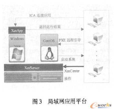 服務器中安裝XenServer系統(tǒng),考慮到客戶端都熟悉Windows平臺下的軟件操作,所以在XenServer中虛擬兩個服務器(可根據(jù)實際需要另行添加),其中一臺運行CentOS,用來提供PXE無盤Linux遠程引導;另外一臺運行Windows Server 2008 + XenApp,進行應用虛擬化。客戶端通過PXE遠程引導至CentOS服務器,運行瀏覽器連接XenApp發(fā)布的應用。局域網(wǎng)服務器需要三塊網(wǎng)卡,一塊用于XenServer,IP設置為192.168.0.1;一塊用于CentOS ,IP設置為192.168.0.2;一塊用于Windows Server 2008, IP設置為192.168.0.3。應用平臺設計如圖3所示。