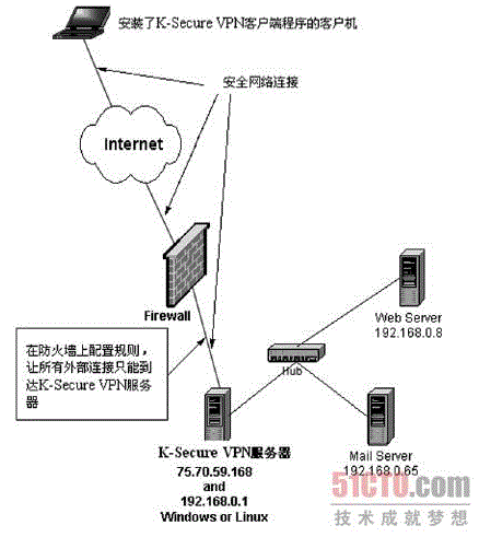 在內網指定主機上( 假設為“Server1”) 安裝KSecureVPN 服務器端程序。該機處于網絡最前沿,隱藏在防火墻之后,內網所有主機都連接在該機上,外部數據必須由防火墻送達該機,經其統一處理后才允許發送給目標主機。