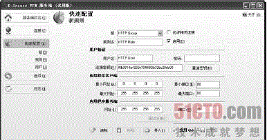 K-Secure VPN 是通過規則控制網絡連接的,在窗口左側單擊“快速配置”按鈕,在右側窗口(如圖4 所示)的“組”欄中輸入或者選擇規則組的名稱(如“HTTP Group”),在“規則名”欄中輸入規則的名稱(如“Http Rule”)。選擇“啟用”項,表示激活本規則。在“用戶名”欄中輸入用戶名稱(如“HTTP User”),只有指定的用戶才可以使用該規則。