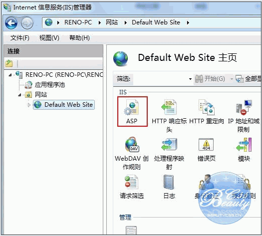 五、選擇 Default Web Site,并雙擊 ASP 的選項,