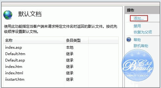 九、點擊 默認文檔, 設置網站的默認文檔。