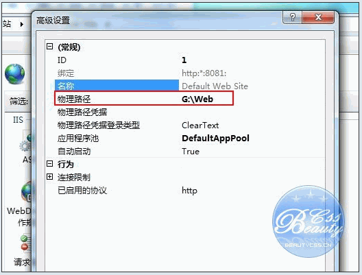 七、配置IIS7的站點。 單擊右邊的 高級設置 選項,可以設置網站的目錄。