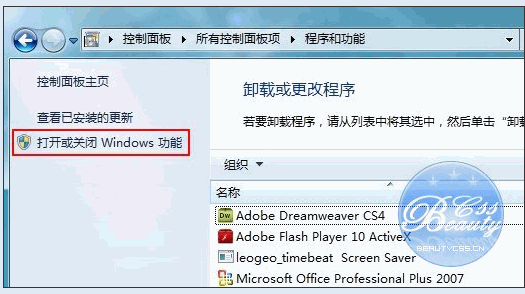 一、進入Windows 7的 控制面板,選擇左側的 打開或關閉Windows功能 。