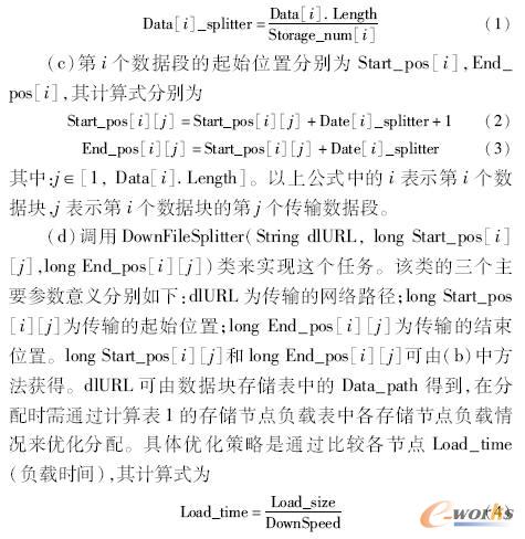 (b)從數據塊存儲表中依次讀取模板文件的各數據塊的Data_path[i]、Storage_num[i](i∈[1,Data_num])。同時,應用HttpURLConnection.getHeaderField(sHeader)函數獲得該數據塊大小Data[i].Length。將該數據塊分為Storage_num[i]個部分。為區別之前提到的數據塊,本文將這Storage_num[i]個部分叫做傳輸數據段。這些數據段的大小為Data_splitter,計算方法為