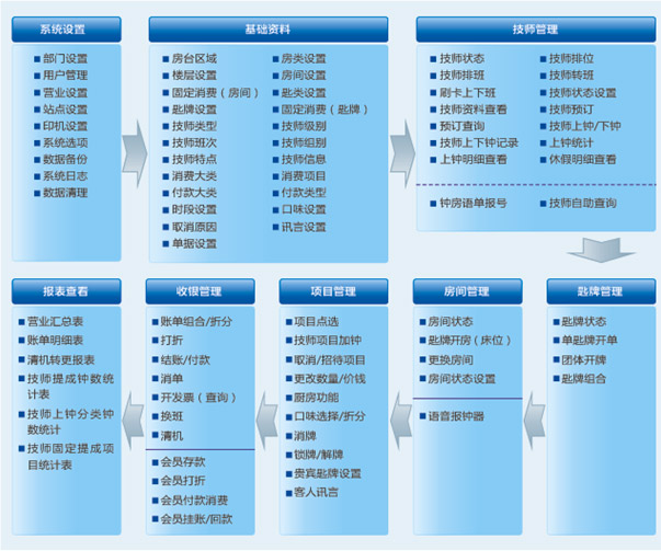 - 7. 通過報表實了解控公司的經營運作和技師情況、并能統計其技師鐘數、提成等。
