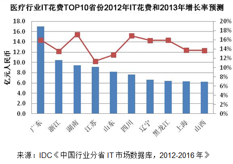 不同省份中同一行業IT市場的發展態勢也有差異。例如醫療行業IT市場,各省的IT花費與其經濟發展并不是完全相關,而與政府的相關規劃和信息化投入的力度更為相關,下圖顯示了2012年醫療行業IT花費前十名的省份及其2013年的預計增長率。