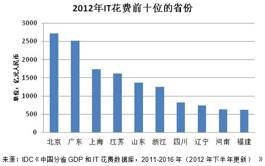 根據(jù)IDC《中國分省GDP和IT花費數(shù)據(jù)庫,2011-2016年(2012年下半年更新)》(文檔號 #CN8037331U),中國總體IT花費在2012年仍保持較高增速,但是2013年其增長速度將出現(xiàn)回落。目前,中國的IT花費仍然集中在少數(shù)省份,但是中等發(fā)達省份的IT市場正在加速發(fā)展,其增速已經(jīng)明顯超越了傳統(tǒng)意義上的IT花費大省。