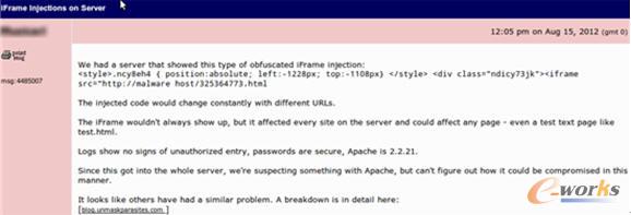 網(wǎng)絡(luò)上有許多博客、文章及論壇都出現(xiàn)了售賣各類用于“滲透測(cè)試”黑客工具的相關(guān)信息。Websense的安全專家監(jiān)視了其中一些論壇,他們發(fā)現(xiàn)最近有一批Rootkits工具正在論壇上販賣,這類Rootkits工具可在Web服務(wù)器架設(shè)的站點(diǎn)上植入和隱藏惡意代碼。雖然不法組織只將這些工具出售給了極少數(shù)人,但研究人員、網(wǎng)站管理員和Web服務(wù)器管理員已經(jīng)發(fā)現(xiàn)了它們,并開始在安全博客及論壇上展開相關(guān)討論。其中,有幾個(gè)論壇的帖子都提到了這樣的現(xiàn)象:同一臺(tái)服務(wù)器上所掛載的不同站點(diǎn)上時(shí)不時(shí)的會(huì)出現(xiàn)一些被植入的惡意iframes代碼段,代碼段中的URL字段會(huì)不斷變化,而網(wǎng)站和Web服務(wù)器的管理員都查不到問題所在。(見圖1)