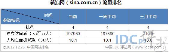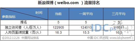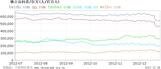中國IDC評述網12月28日報道:據中國互聯網協會-中國網站排名公布的最新數據顯示,截至2012年12月26日,國內網站獨立訪問量排名前五的是:百度、騰訊網、淘寶網、新浪網和新浪微博,如下圖。