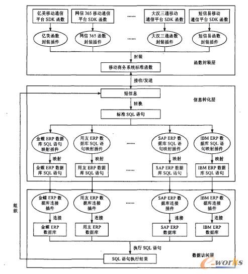 (1)封裝功能:該功能位于函數封裝層,以插件的形式提供,每一個移動通信平臺SDK都對應一個插件,其功能是將對應的移動通信平臺SDK函數封裝成移動商務系統標準函數,供信息轉化層調用。