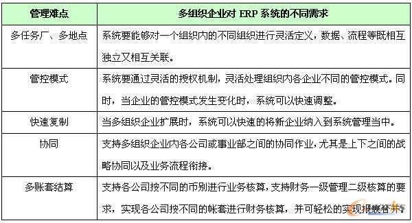 多組織化企業與單組織企業的管理相比,要復雜的多,多組織化企業必須要處理多任務廠之間的協同作業,多組織之間的財務核算,資金流、物流、信息流、工作流分離的管理模式等問題,而這些管理要求也造成了多組織應用架構的ERP與單組織應用架構的ERP系統之間最大的區別。當然,如果是集團化的多組織企業,ERP還要能靈活的處理不同集團企業的管控模式。