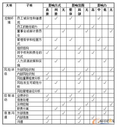 對照上述的分析,我們可以得出一個ERP在企業內部控制體系中所起作用大小的影響表如下。其中,影響方式指ERP對內部控制系統的幫助是直接的、由其自身特點帶來的,還是間接的、由于使用ERP改善管理與環境帶來的;影響范圍指的是ERP在該領域帶來的影響是針對企業全局的,還是限于企業內部部分人員與機構的;影響力則指是否應用ERP系統,對該控制的領域所造成的變化。
