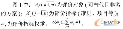 關聯矩陣法作為一種定量與定性相結合的評價方法,是對多目標系統方案從多個因素出發綜合評定優劣程度的最佳方法,它用矩陣形式來表示各替代方案有關評價指標的評價值,然后計算各方案評價值的加權和,再通過分析比較,確定評價值加權和最大的方案即為最優方案。關聯矩陣法是因其整個程序如同一個矩陣排列而得名,如圖1所示為關聯矩陣。