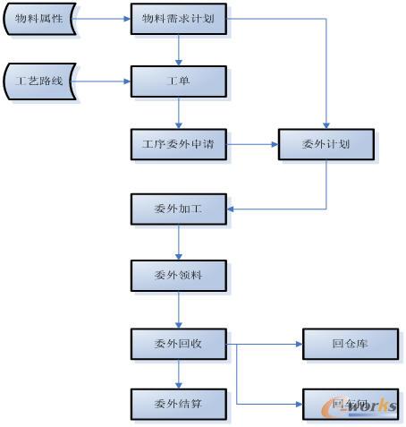 在ERP系統中首先需要根據物料的生產過程,即物料的生產是完全由企業自己承擔,還是部分工序由本企業加工處理及部分工序由委外廠商完成,對于物料完全由本企業完成的,設置其屬性為物料委外,否則設置為工序委外。這樣設置后,在MRP分解結果中,物料委外的部分將自動轉到委外處理,相關業務人員從而可以據此產生委外加工訂單,做出相應的處理;工序委外的部分,在物料對應的工藝路線中應設置好哪道工序是委外工序,當加工處理到相應工序時,系統能自動根據其工序匯報的數量當作下道委外工序的接收數量,如果是第一道工序也自動轉到委外系統中去處理,委外加工完畢,委外回收單再根據ERP系統定義的回收程序分別回不同的車間或倉庫。這樣整個系統能自然銜接,保證物流通暢,信息流也形成一個閉環,方便進行核算。