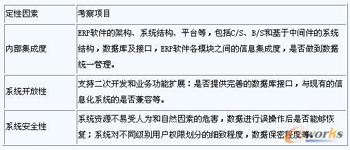 其中,以ERP軟件評價模型的定性因素描述如下,各中小企業可以根據對自身實際情況和選型戰略的認識,確定各自準則層、指標層的具體評價指標和權重。