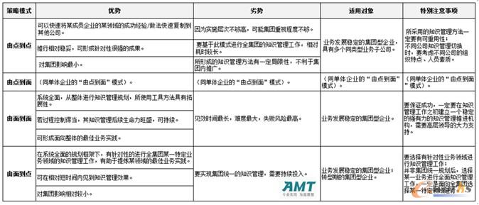 集團型企業與單體企業不同,AMT咨詢認為可以簡單理解成:集團型企業由多個不同的單體企業組成,其在組織的復雜度、管理的難度方面,都較單體企業有較大的差異。因此,集團型企業進行知識管理可能面對的難度比單體企業要大很多,如果從“組織實施范圍——業務領域范圍”兩個維度分析,其實施策略可形成2X2矩陣,存在四種實施策略:由點到點、由點到面、由面到面、由面到點。