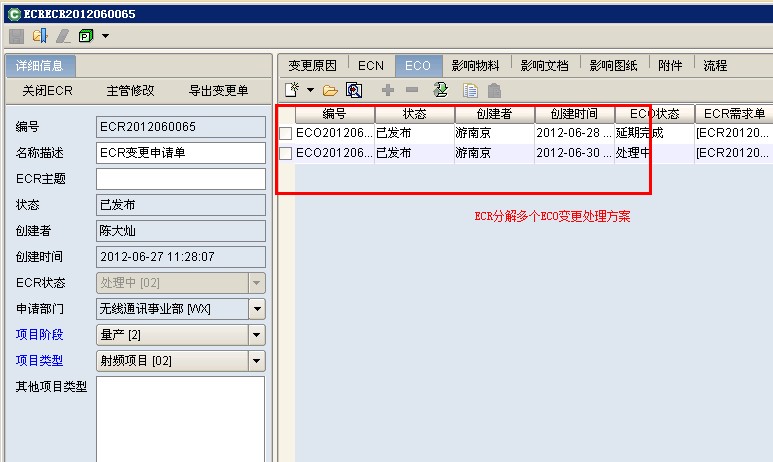 建立一個(gè)ECR對應(yīng)多個(gè)ECO的管理機(jī)制。即依據(jù)審批后ECR申請,建立多個(gè)ECO變更處理方案,從而使每個(gè)ECO處理方案對應(yīng)唯一的處理責(zé)任人,形成變更任務(wù)的追蹤機(jī)制,明確變更處理任務(wù)責(zé)任人、處理要求時(shí)間,同時(shí)通過反饋實(shí)際完成時(shí)間來監(jiān)控變更處理完成進(jìn)度,增強(qiáng)變更處理的執(zhí)行效率并為研發(fā)的績效考核提供依據(jù)。