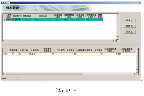 5)首先通過鎖庫功能對銷售訂單SO01進(jìn)行鎖庫處理,將生產(chǎn)任務(wù)單WORK000010已入庫的50PCS進(jìn)行鎖庫(圖:6)