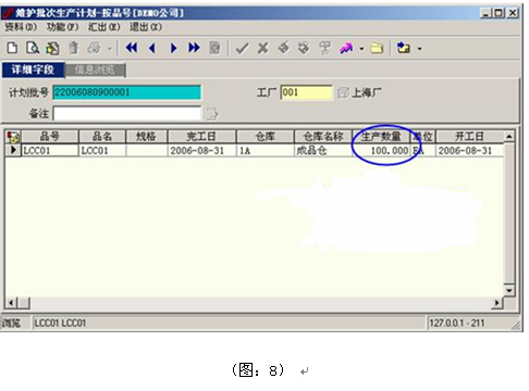 1)選擇SO01進(jìn)行計算LRP,系統(tǒng)產(chǎn)生100數(shù)量之“生產(chǎn)計劃”(圖:8);