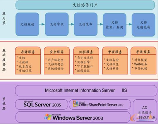文檔管理控制解決方案為三層架構,分別是系統層、基礎服務層、應用層。