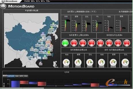 在這個系統里老板會看到各式各樣不同的內容,包括營業收入分析,在這個分析中涵蓋了各個地區銷售的達成情況、車間的生產進展情況,以及各個產品線的銷售情況的對比,系統將這些數據分布在同一個界面做展現。包括風險預警和預測分析,比如系統根據目前銷售的狀況對下半年的達成情況進行預測。