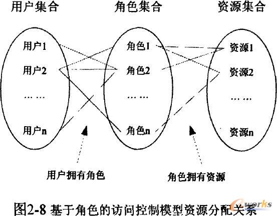 基于角色的訪問控制模型通過在用戶和權限之間引入角色這個中介,為用戶授予角色,為角色授予權限,用戶通過角色間接訪問系統資源,限的邏輯分離。圖給出了用戶、角色、與權限的職責分離關系。實現了用戶與權資源分配關系如圖2-8所示: