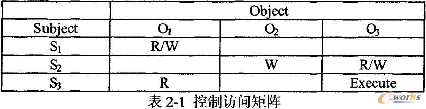 A,表示了si對oj可進行的訪問操作權限。每次用戶提出訪問的請求時,需要對存取控制矩陣進行一次掃描。存取控制矩陣可表示如表2-1: