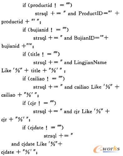 在圖文檔管理系統中,產品結構樹的構建是通過產品大類、產品和零、部件來完成。產品屬于產品大類,部件又屬于產品,零件可能屬于產品也可能屬于部件。本系統是通過逐步縮小查詢范圍和對產品大類、產品和零、部件的基本屬性信息任意組合的方式進行模糊查詢,當然直接通過對基本屬性任意組合進行模糊查詢也可以。筆者主要介紹通過下拉列表框的選擇,逐步縮小查詢范圍,從而使用戶快速地獲得準確的信息。對于查詢結果,用Gridview控件顯示,用戶可以對查詢結果編輯、刪除和瀏覽,并保證用戶只能編輯和刪除自己撰寫的信息,這樣也保證了系統的安全性。