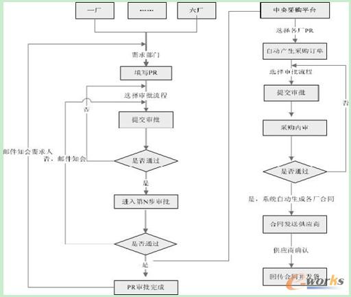 縱觀目前PCB 行業,至今尚未有可供參考的其他集團化(多工廠)的信息平臺處理解決方案(Oracle,SAP 等大型信息管理系統供應商可以提供,但成本高昂),基于現狀,結合事業部中央采購實際運作狀況,信息中心通過多次需求調研、流程分析以及研究開發架構,充分思索和運用BPR(業務流程重組)的理論,最終架構出中央采購平臺運作模式的電子化解決方案。