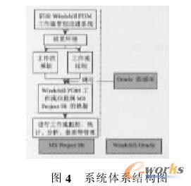 因此,基于Windchill PDM工作流管理系統(tǒng)集成MS Project98系統(tǒng)在理論上是可行的?捎袃煞N方案來進(jìn)行集成:一是利用Windchill PDM中的類和函數(shù)來處理工作流的各種數(shù)據(jù),將之轉(zhuǎn)換成MSProject98可以直接讀取的數(shù)據(jù)格式。但是這種方法需要在Windchill PDM里進(jìn)行一次開發(fā),同時需要在每臺需要運(yùn)行本系統(tǒng)的計算機(jī)上都要安裝有Windchill PDM才能運(yùn)行,對電腦硬件要求太高,本系統(tǒng)的普遍適用性將大大降低。所以我們采取第一種方案:直接在MS Project98中對Windchill PDM的ORACLE數(shù)據(jù)庫進(jìn)行操作,讀取其工作流數(shù)據(jù),然后在MS Project98中進(jìn)行處理。本系統(tǒng)體系結(jié)構(gòu)圖如圖4所示。
