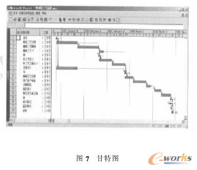 其一,MS Project 98對工作流程的監(jiān)控、統(tǒng)計、分析和報表功能較強(qiáng)大。它利用甘特圖來進(jìn)行任務(wù)在時序關(guān)系上的監(jiān)視和管理,甘特圖用水平線段表示任務(wù)的工作階段,線段的起點(diǎn)和終點(diǎn)分別對應(yīng)著任務(wù)的開工時間和完成時間,線段的長度表示完成任務(wù)所需的時間。甘特圖優(yōu)點(diǎn)是標(biāo)明了各任務(wù)的計劃進(jìn)度和當(dāng)前進(jìn)度,能動態(tài)地反映項(xiàng)目開發(fā)進(jìn)展。圖3是一個典型的甘特圖。MS Project98利用各種資源視圖和報表統(tǒng)計、打印功能來滿足用戶對工作流程的資源分配和使用、人員分配以及成本等等方而的管理要求。