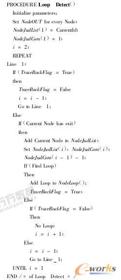 因?yàn)樵谘h(huán)的最后一次執(zhí)行時,在執(zhí)行完關(guān)鍵路徑部分后,直接執(zhí)行反饋閉環(huán)外的下一個任務(wù)(如圖6的任務(wù)A)不執(zhí)行反饋體部分,所以關(guān)鍵路徑部分要比反饋體部分多執(zhí)行一次,因而關(guān)鍵路徑部分要執(zhí)行K+1次。要解決反饋問題,首先要識別工作流中的閉環(huán),然后才能按照上而的方法表達(dá)。我們采用人工智能技術(shù)中的深度優(yōu)先搜索算法來識別工作流中的閉環(huán),這種算法是完備的,可以識別出所有的閉環(huán)。深度優(yōu)先搜索算法如下: