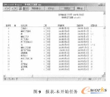 運(yùn)行Windchill PDM工作流管理改進(jìn)系統(tǒng)后,首先彈出對話框,顯示該工作流存在1個閉環(huán),用戶輸入反饋體需要執(zhí)行的次數(shù)為2后,執(zhí)行得到如圖7所示的甘特圖顯示。用戶還可以選擇不同的視圖來管理該流程。例如選擇顯示統(tǒng)籌圖,則可以得到如圖8所示的統(tǒng)籌圖信息。該視圖直觀地體現(xiàn)了任務(wù)之間的邏輯時序關(guān)系,可供工作人員監(jiān)控工作流程。如圖9所示的未開始任務(wù)報表則統(tǒng)計了所有到目前還未開始的任務(wù),并以報表形式打印。