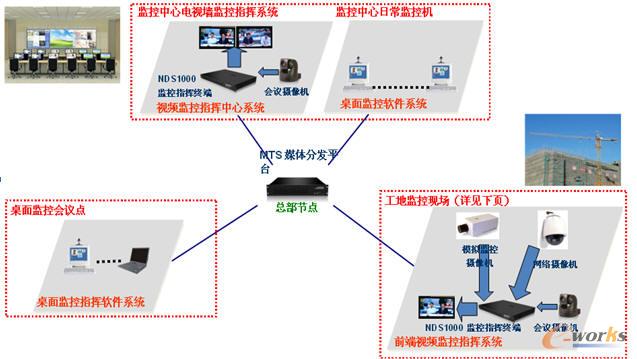 (4)在大型工地塔吊等不便埋線的監(jiān)控位置,安裝微波收發(fā)設備及IP Camera網絡攝像機,其他位置安裝光纖接入的模擬監(jiān)控攝像機;配置1臺MGS媒體網關服務器為當?shù)鼐钟蚓W內的網絡攝像機提供媒體轉接服務;使用1臺NDS1000監(jiān)控指揮終端,接入室內會議攝像機,對本地工地畫面進行監(jiān)看的同時,也可進行視頻會議并被遠程監(jiān)看;