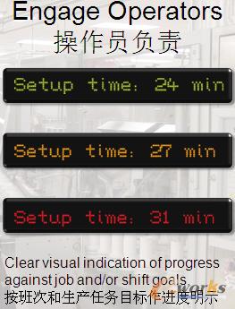 如圖4我們可以用LED顯示整個操作的過程,可以讓操作員看到,也可以在產線上看到,比如說SETUP的模式是24分鐘,用綠色表示;如果超出這個標準但是在允許的一個范圍內的話,用黃色表示,這樣員工就可以看到機器SETUP的時間過長;如果再超出,就用紅色顯示。通過LDE顯示,可以增加員工的責任感,以及工作一天下來的成就感。