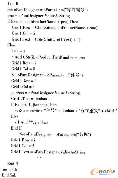 提取并統計單個零件的BOM信息的工作由一個函數extract_single_BOM完成,首先通過參數的Parameters方法獲得要提取的屬性對的集合。其中選取出類型參數,與預先在界面上選取的類型比較,若不是則不提取該節點中的屬性。在統計過程中,建立以零件編號為鍵值,網格中顯示的行號作為值的hash表全局變量,提取屬性時提取出零件編號,在建立的hash表中檢索。若已經在表中存在,則認為是已經出現過類型的零件,可以從對應的值取出行號,將對應單元格的值加一;若獲在表中沒有,則將當前行值加一,并將鍵值對添加到hash表中,以便后續重復元素統計修改對應行的值。