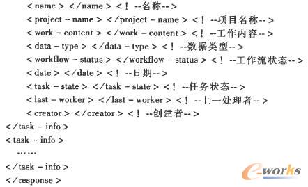 (4)登錄PDM系統(tǒng)后,查詢?cè)撚脩舻漠?dāng)前工作,然后組織成XML信息返回給OA系統(tǒng),其XML格式如下: