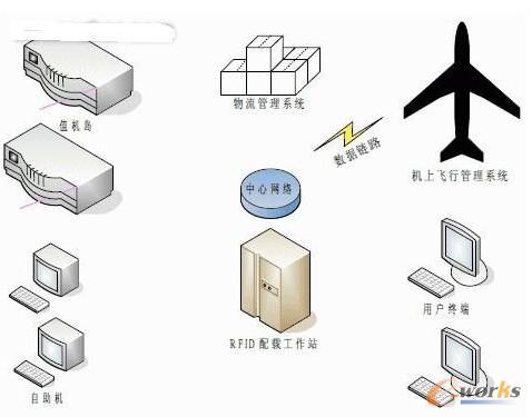 該系統的組成包括:機場值機系統、空地數據鏈、RFID配載工作站和機載飛行管理系統。