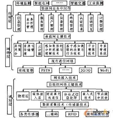 根據產業技術鏈的相關理論,要了解物聯網產業技術鏈,首先應明確物聯網的體系架構及其每一層所涉及的關鍵技術;诂F有對物聯網體系架構及其所涉及的關鍵技術的研究成果,本文通過描繪物聯網技術體系架構(見圖1),來說明物聯網產業技術鏈。