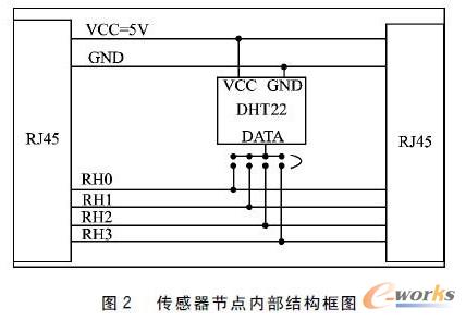 傳感器節(jié)點(diǎn)內(nèi)部結(jié)構(gòu)框圖如圖2所示。4個(gè)傳感器DHT22的DATA引腳通過(guò)4位撥碼開(kāi)關(guān)分別連接至4根數(shù)據(jù)線(xiàn)即可。
