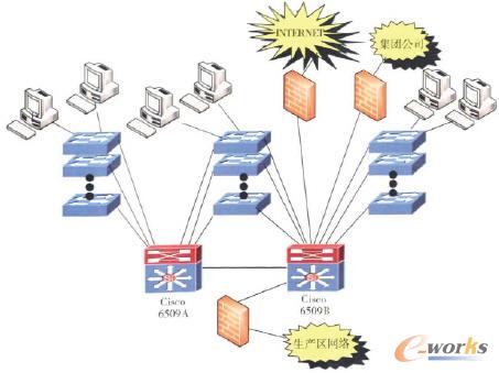在公司計算機網絡系統擴容升級改造時,網絡系統結構布局上采用了簡單的“星型”結構,數據信息直接交換到桌面(見圖1),計算機網絡系統結構中的核心設備采用2臺思科交換路由器Cisco 6509, 互為冗余。用戶接人端采用了思科交換器Cisco 3550、Cisco 2950、Cisco 3750等,每個用戶通過這些交換設備接口規范化接入就近的交換機,為易維護網絡建立了物理硬件基礎。