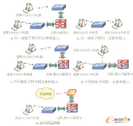 2)不同虛擬子網內2臺機器交換數據,通過接人交換機1、核心設備交換功能部分、路由功能部分、另一臺接人交換機2(見圖3c),或通過接人交換機1、核心設備交換功能部分、路由功能部分、同一臺接人交換機1(見圖3d)。