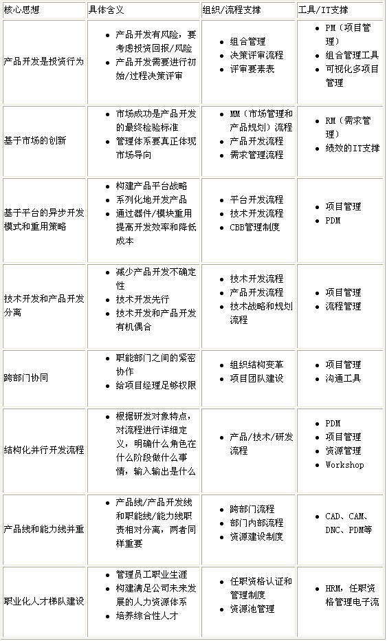 IPD的核心思想包括八個方面,在下表中對八個方面的核心思想具體含義進行描述,并列出要體現(xiàn)這些思想所必需的組織、流程、以及工具/IT支撐(包括PLM系統(tǒng)):