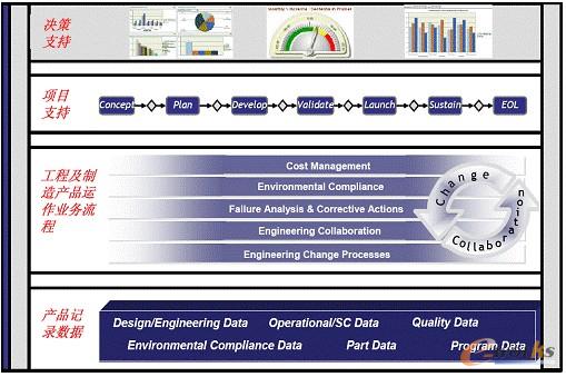 Agile PLM系統(tǒng)側重從管理方面進行構架,同時提供和設計軟件CAD、CAM等的接口,以及和CRM、SCM、ERP。從下圖看出,系統(tǒng)提供統(tǒng)一的產品記錄數據,提供企業(yè)單一的數據來源,在此基礎上,構建工程和制造產品運作業(yè)務流程,包括成本管理、工程變更管理、質量保證等: