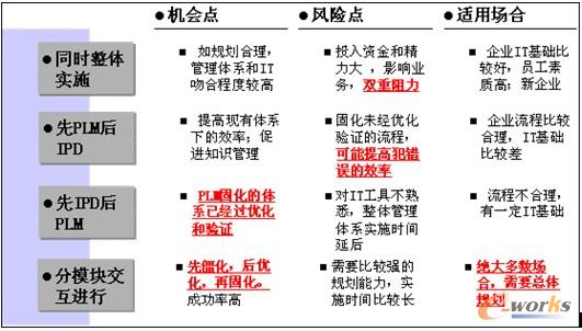 在以上三個前提條件下,兩個系統(tǒng)的建設可以分步進行。建議在用PLM系統(tǒng)固化產品開發(fā)流程之前,首先參照IPD研發(fā)模式定義總體產品開發(fā)流程框架,包括產品開發(fā)流程以及該流程和其它流程,比如技術開發(fā)流程、產品規(guī)劃流程之間的接口關系等等。對PLM而言,一些局部的模塊,比如產品設計和模塊構建(CAD、CAE等)、項目管理、溝通交流等,可以獨立建設,但是要考慮并預留和PLM系統(tǒng)中其它模塊的接口,每個模塊既要相互獨立,但又不能孤立。