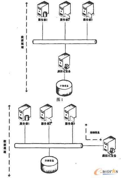 目前,存儲(chǔ)虛擬化的發(fā)展尚無(wú)統(tǒng)一標(biāo)準(zhǔn)。從存儲(chǔ)虛擬化的拓?fù)浣Y(jié)構(gòu)來(lái)講,有對(duì)稱式和非對(duì)稱式兩種,根據(jù)實(shí)現(xiàn)機(jī)制又分為帶內(nèi)和帶外兩種基本類型。兩種方式的主要區(qū)別在于存儲(chǔ)網(wǎng)絡(luò)中數(shù)據(jù)I/O與控制信息是否使用同一通道,如圖1和2所示。