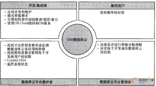 但是這種管理模式革命性的變更,也帶來了對(duì)應(yīng)用/系統(tǒng)管理維護(hù)的新需求。傳統(tǒng)方式中,在大多數(shù)的實(shí)際情況下,應(yīng)用軟件的開發(fā)商SI不僅僅是對(duì)自己的應(yīng)用提供運(yùn)維,而且也對(duì)其應(yīng)用之下的平臺(tái)軟件/硬件進(jìn)行主要的運(yùn)維操作,并根。據(jù)實(shí)際運(yùn)行的情況,對(duì)用戶提出基礎(chǔ)架構(gòu)擴(kuò)容和調(diào)整的需求。在采用PaaS提供數(shù)據(jù)庫云的方式下。之前的SI全部負(fù)責(zé)的方式必然不可行。因?yàn)镾I不再負(fù)責(zé)包括基礎(chǔ)硬件和數(shù)據(jù)庫軟件的數(shù)據(jù)庫平臺(tái)的運(yùn)維,而只是一個(gè)數(shù)據(jù)庫作為服務(wù)的消費(fèi)者,必須要有第三方負(fù)責(zé)相應(yīng)云平臺(tái)的運(yùn)維。同時(shí),由于實(shí)際的情況,SI往往會(huì)提出自己的數(shù)據(jù)庫服務(wù)需要的資源變更請(qǐng)求,對(duì)于這些資源變更請(qǐng)求的評(píng)估和批準(zhǔn)。當(dāng)然也應(yīng)該由SI之外的人員/組織予以完成。簡單總結(jié)一下,在采用數(shù)據(jù)庫云平臺(tái)后,原來的SI和最終用戶的關(guān)系會(huì)演變成如下4方面的關(guān)系,如圖8所示。