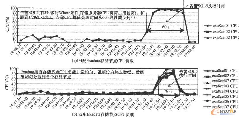 對(duì)于Exadata的數(shù)據(jù)庫云平臺(tái)擴(kuò)展能力測(cè)試,告警SQL5(CPU高負(fù)載SQL,SQL達(dá)34 KB)從1/4配(執(zhí)行時(shí)間0:01:08)擴(kuò)展到1/2配(執(zhí)行時(shí)間0:00:31)時(shí),可以明顯發(fā)現(xiàn)執(zhí)行時(shí)間線性減少(從68 8到31s),如圖13所示。