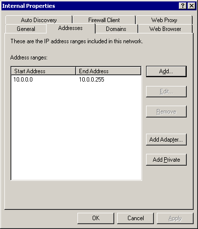 首先,你得確認你的內部網絡地址集中包含了整個內部網絡。這是非常重要的,因為IPSec策略必須在建立連接的兩邊都要匹配,否則,連接不會建立。打開你內部網絡的屬性,如下圖: