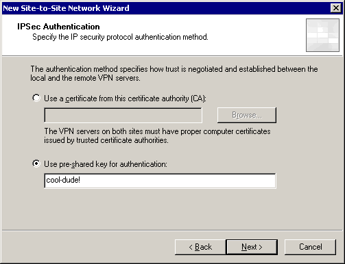 輸入D-link路由器的外部IP作為遠程VPN網關的IP,然后選擇ISA Server的外部IP作為本地VPN網關的IP,